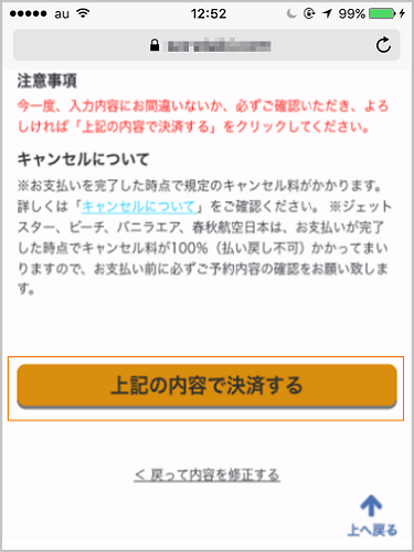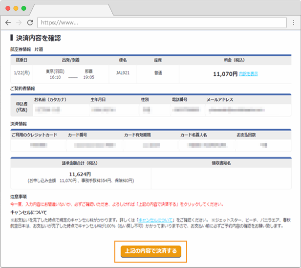 ③ 決済内容と注意事項を確認し、【上記の内容で決済する】をクリック
